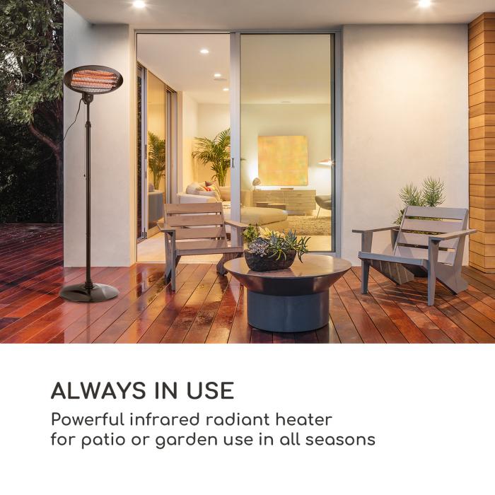 It is a powerful infrared radiant heater for patio or garden use in every season with fast heat generation by up to three quartz heating tubes in the infrared range. One of the best selling patio heaters with 3x heating levels of up to 2000 watts of power. Featuring Quality Infra Red Comfort, this Heater warms you and your family with proven safe, cosy and warm infrared rays on those chilly days & nights!