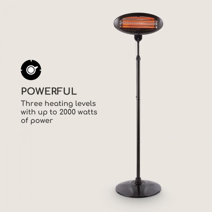 Power: 650/1300/2000 watts, Effective area: up to 40 m², Effective range: approx. 5 m, Degree of protection: IP34, generates heat immediately, 3 power levels, Quartz heating tubes, Operation via rope pull switch, extendable stand and rotating and tilting heating element.